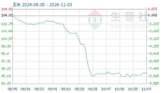 On November 3rd, the corn commodity index was 95.60, unchanged from yesterday, down 25.70% from the highest point of 128.67 points during the cycle (March 9, 2021), and up 41.15% from the lowest point of 67.73 points on February 28, 2017. (Note: The cycle refers to the period from September 1, 2011 to present)